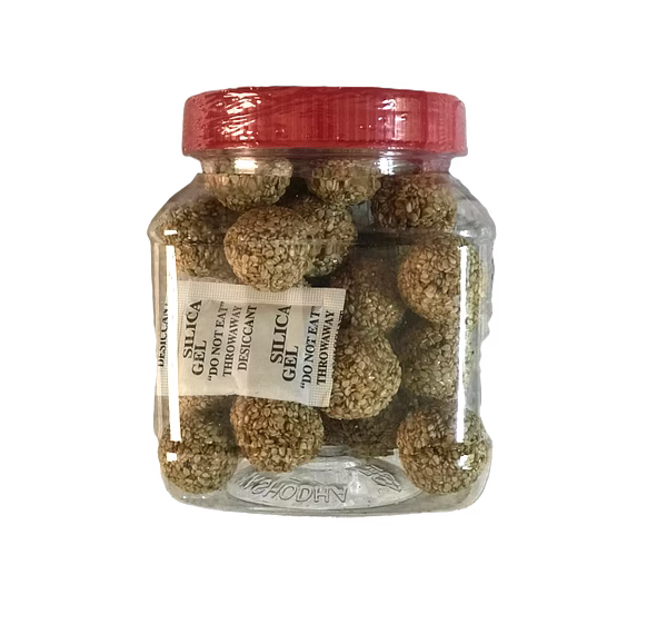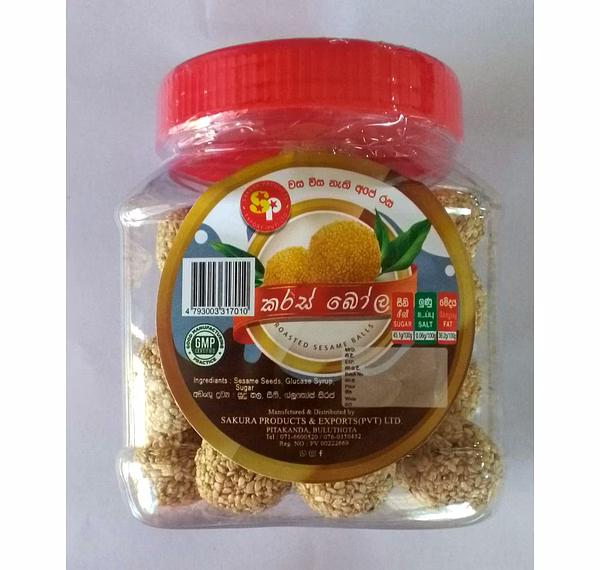 Sakura Karas Bola in a plastic jar offers both visual appeal and long-lasting freshness. Made from carefully selected white sesame seeds, these crunchy sweets are a staple in Sri Lankan households.