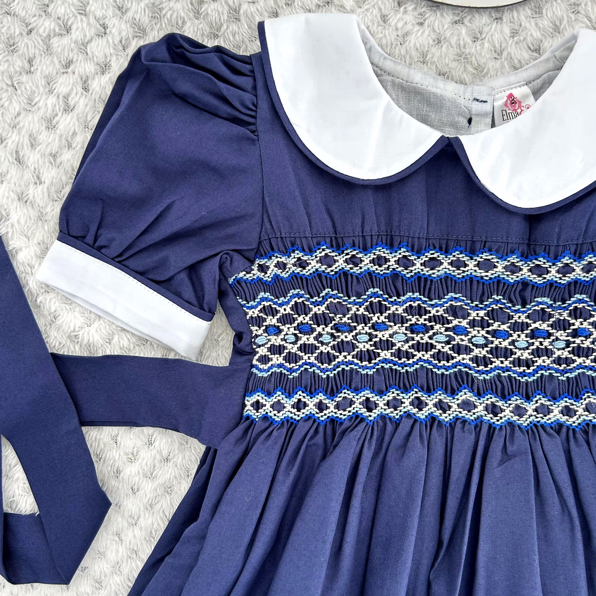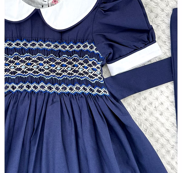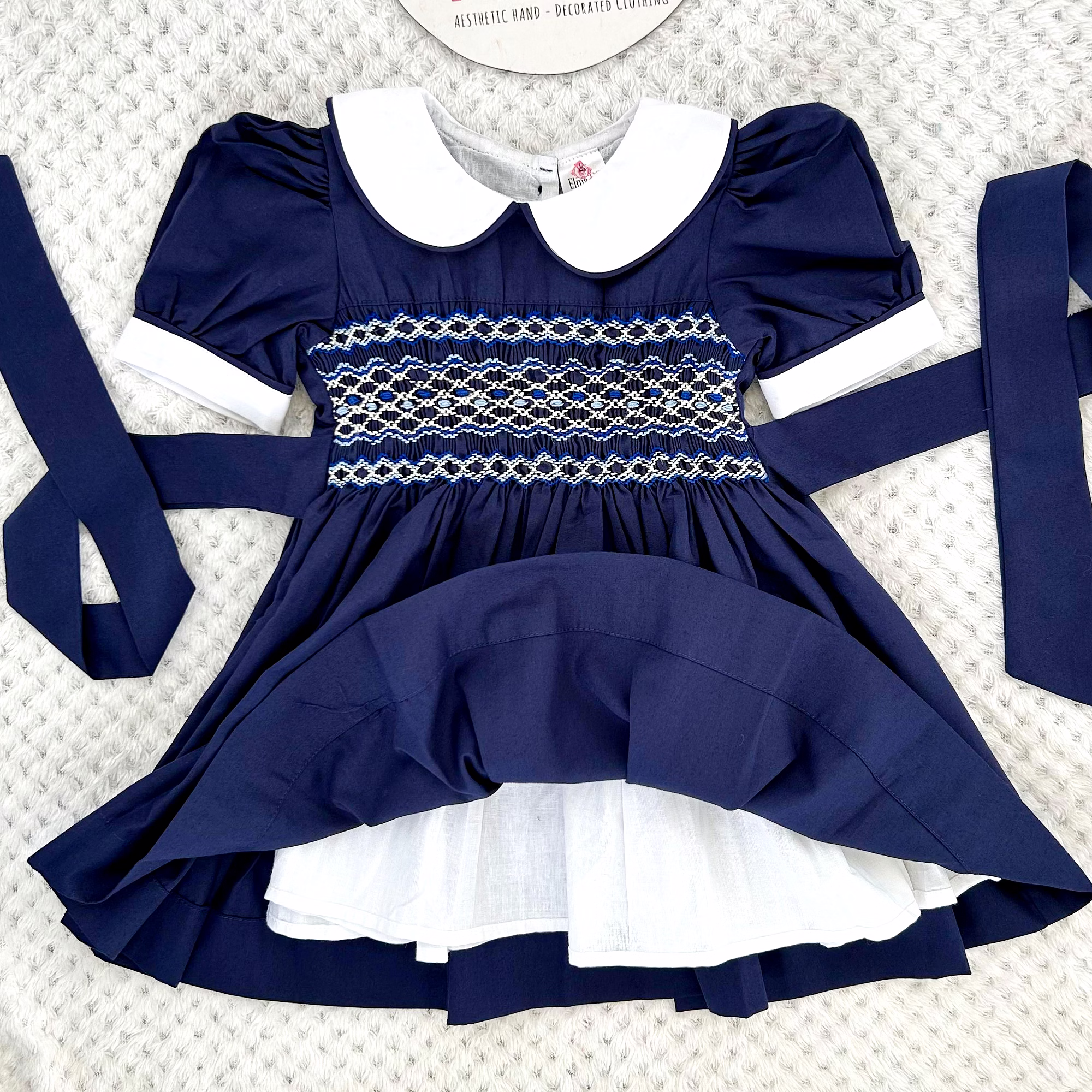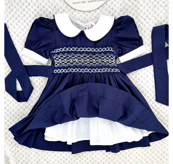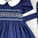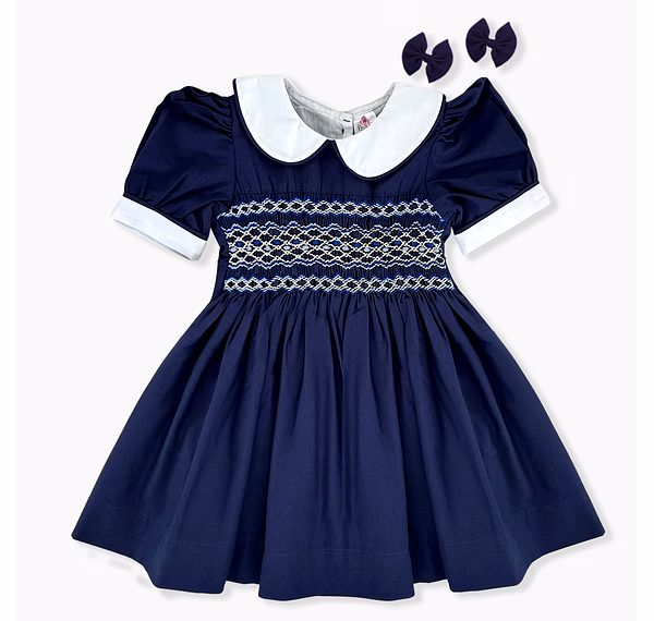 Design Features: Hand-smocked and hand-embroidered.Elegantly designed with a white Peter Pan collar, puffed sleeves with a white sleeve band. Charm, simple dark blue and white embroidery design.