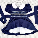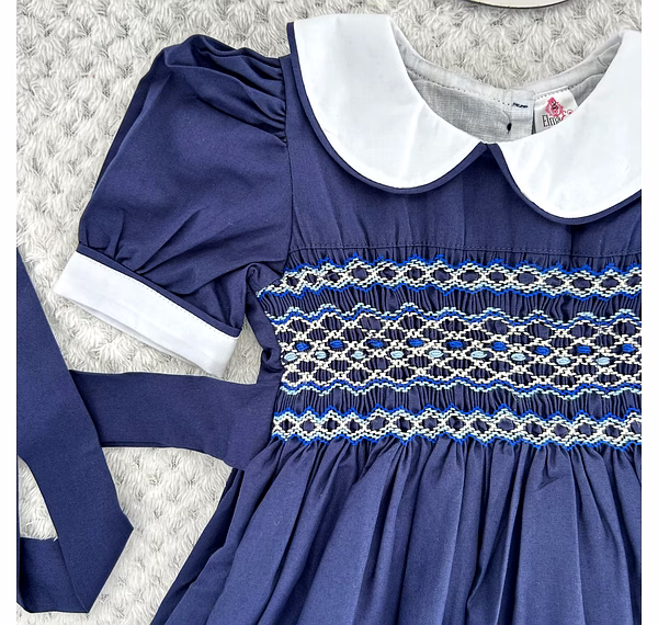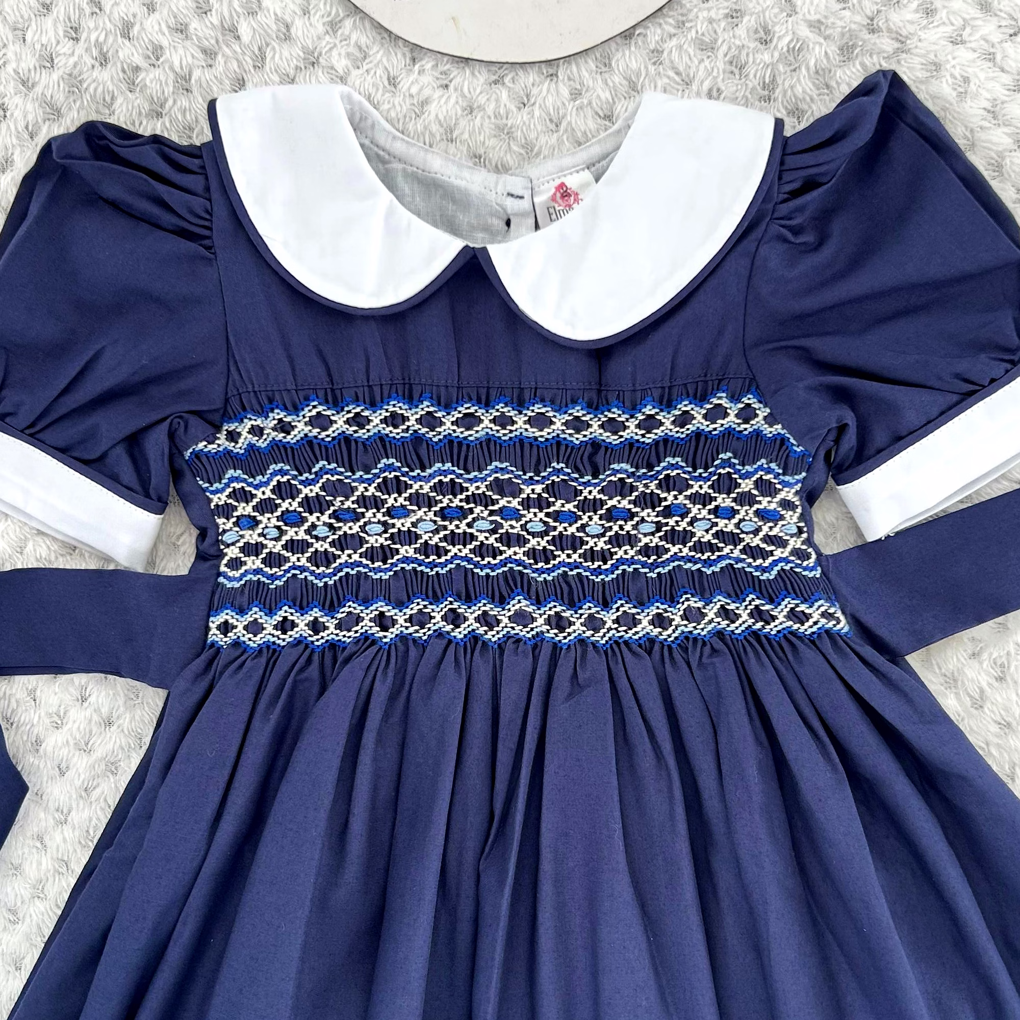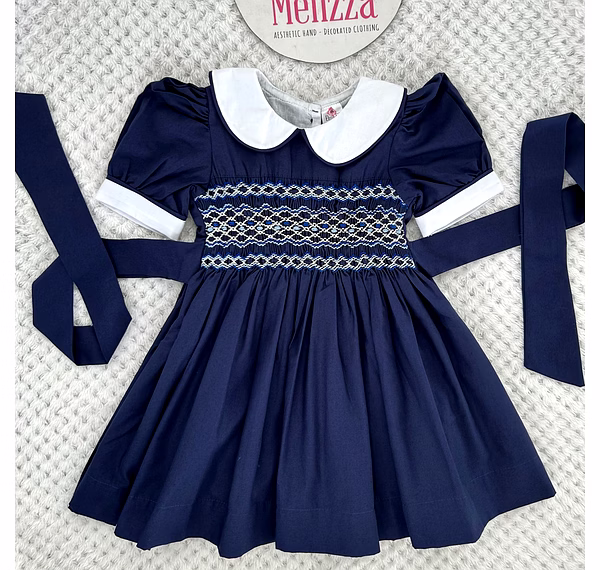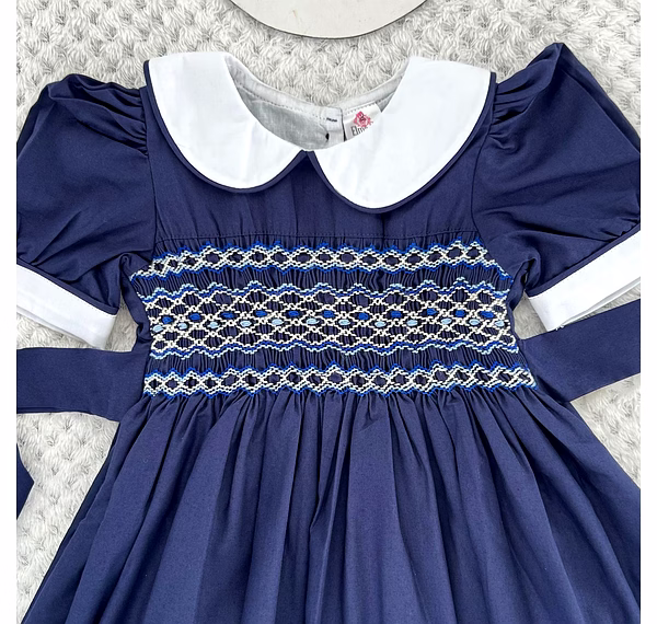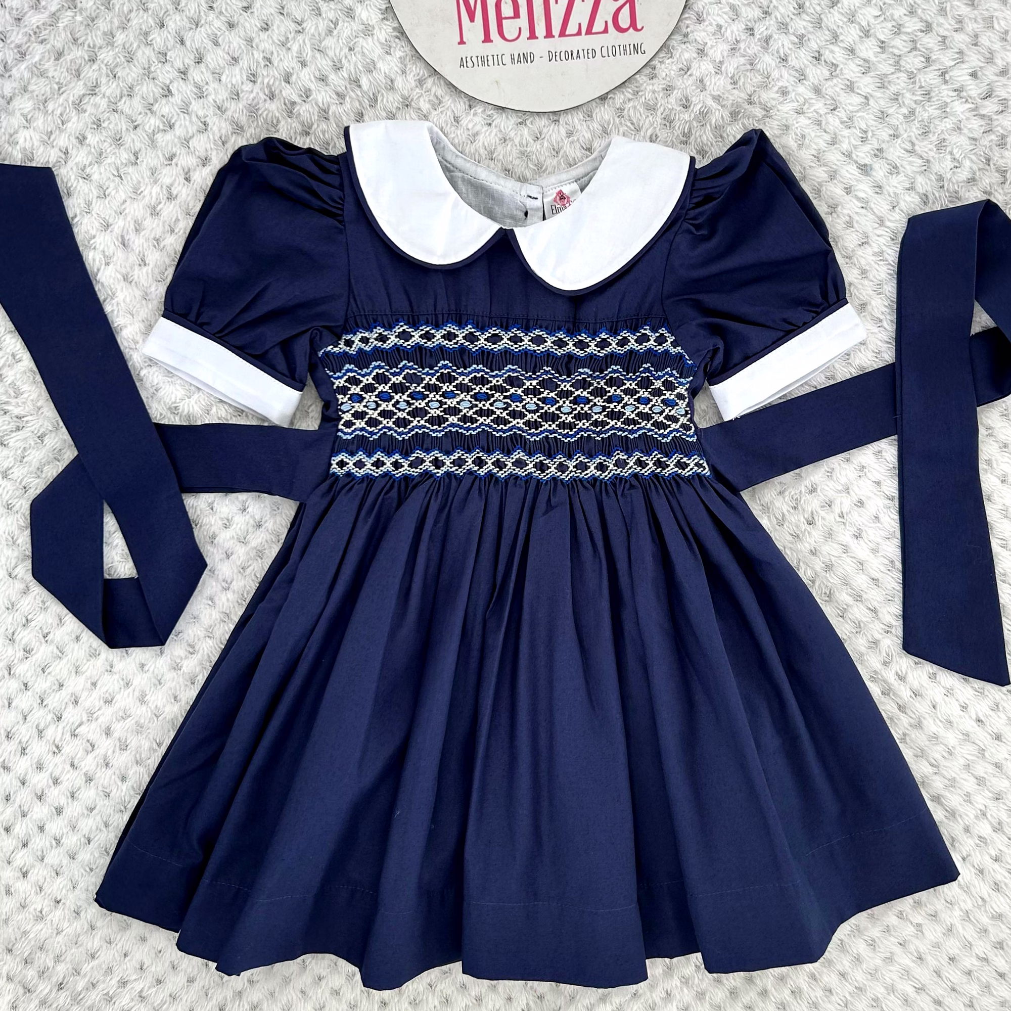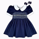 Design Features: Hand-smocked and hand-embroidered.Elegantly designed with a white Peter Pan collar, puffed sleeves with a white sleeve band. Charm, simple dark blue and white embroidery design.