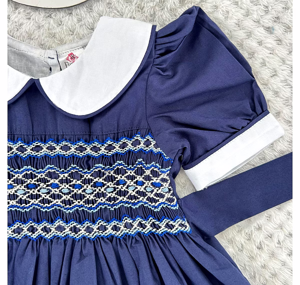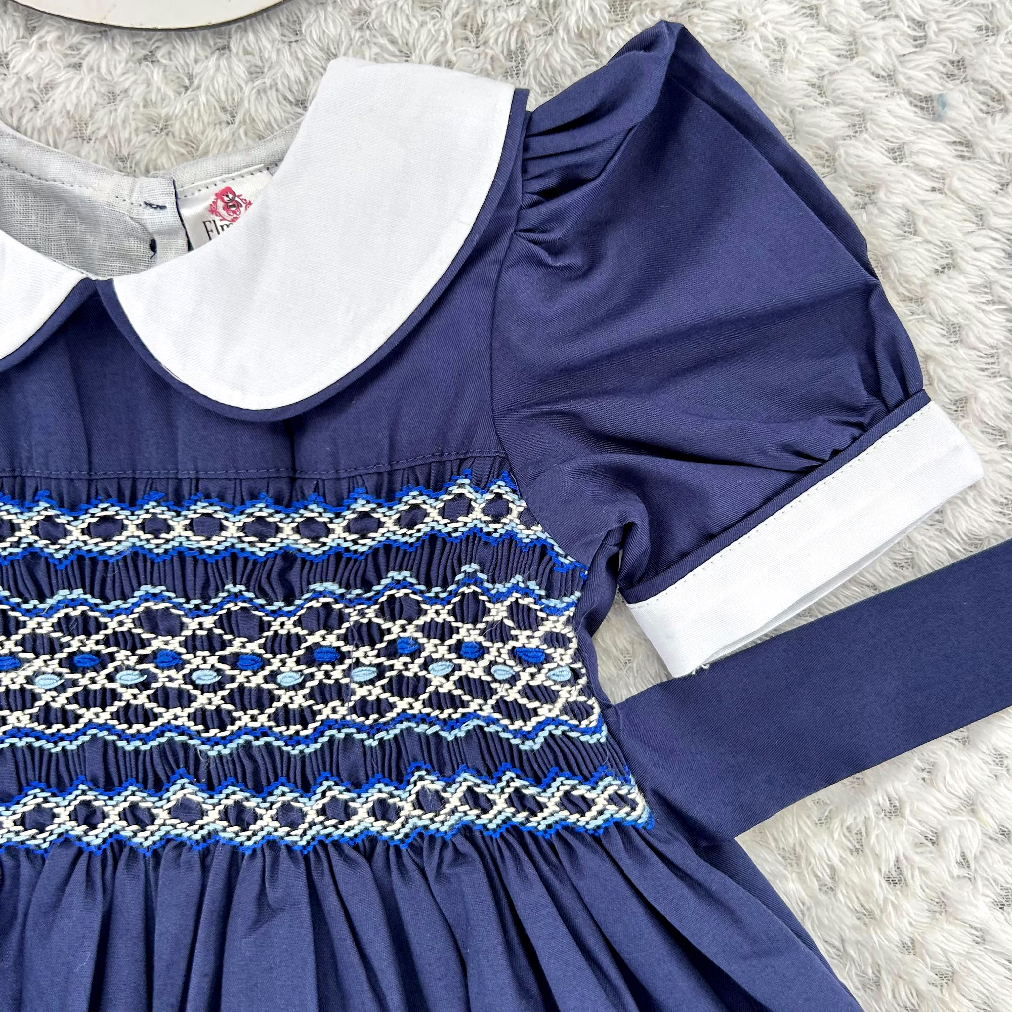 The chest features exquisite hand-smocked embroidery in light and dark blue floral patterns, offering a handcrafted charm that machine-made pieces can’t match. The classic Peter Pan collar, trimmed in matching midnight blue, and the puffed sleeves with crisp white borders add timeless character. Each stitch speaks of artisan craftsmanship and delicate beauty, making it an heirloom-worthy piece in any baby girl's wardrobe.