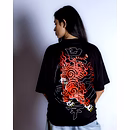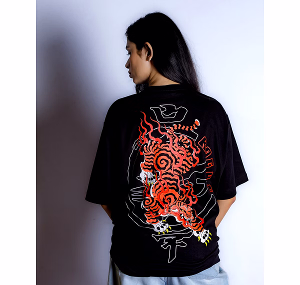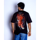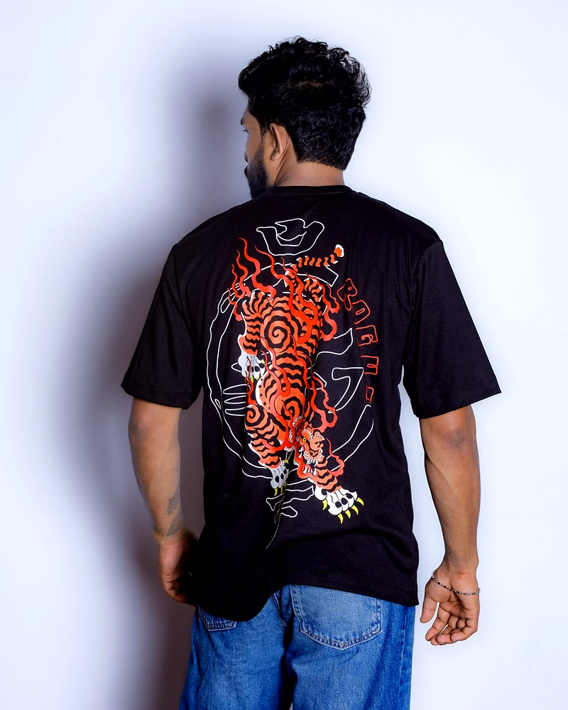 Unleash your inner rebel with the Blazing Tiger Oversized T-Shirt. This isn't just a piece of clothing; it's a statement of raw intensity and courage. Set against a deep black canvas, a magnificent tiger, rendered with striking Japanese artistry, roars to life in fiery hues. The dynamic, blazing design isn't just an image—it's a symbol of your own untamed spirit.
