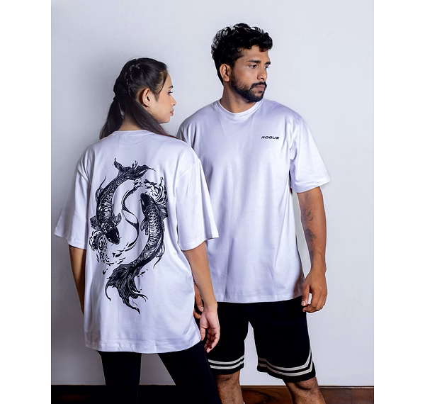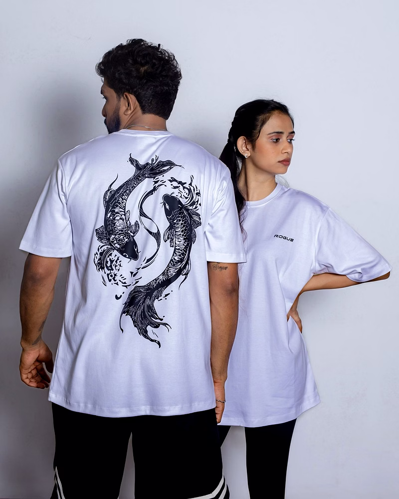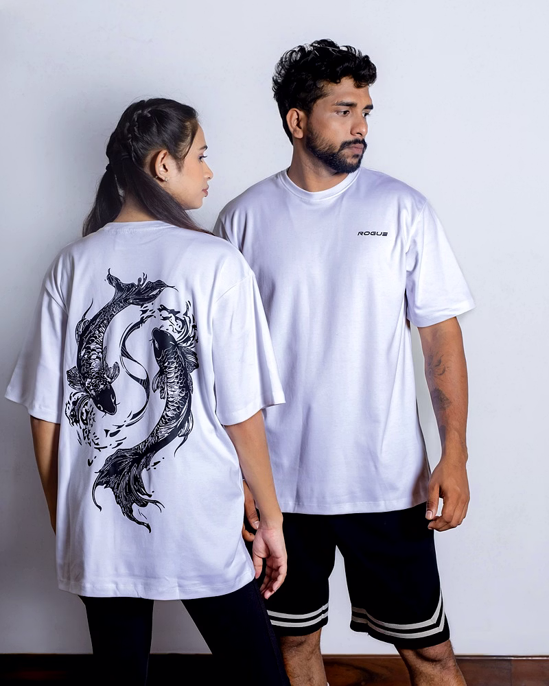 Embrace the peaceful strength of the koi with this white oversized unisex tee, a symbol of transformation and persistence. Inspired by the koi fish's legendary journey against the current, the flowing back design merges Japanese tradition with modern streetwear flair. This shirt is for those who find calm power in the face of adversity.