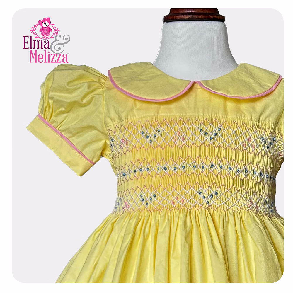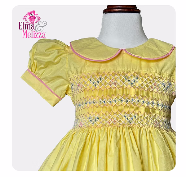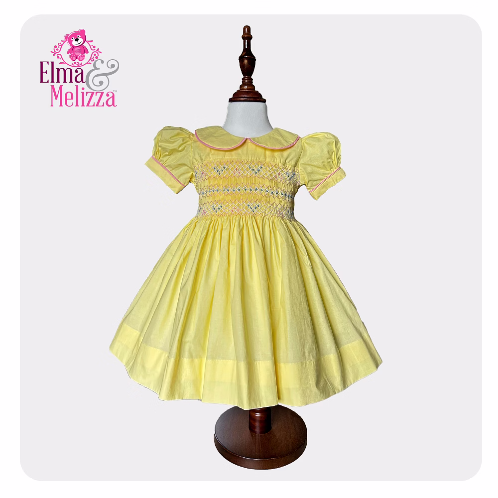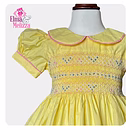 Wrap your little one in the sunshine glow of this Yellow Hand-Smocked Embroidered Baby Girl Dress — the perfect blend of timeless craftsmanship and childhood charm. Delicately smocked by hand and adorned with finely embroidered blue and pink roses, this dress transforms any occasion into a treasured memory. The soft, breathable cotton ensures lasting comfort, while its elegant Peter Pan collar and puffed sleeves add a classic, storybook touch.