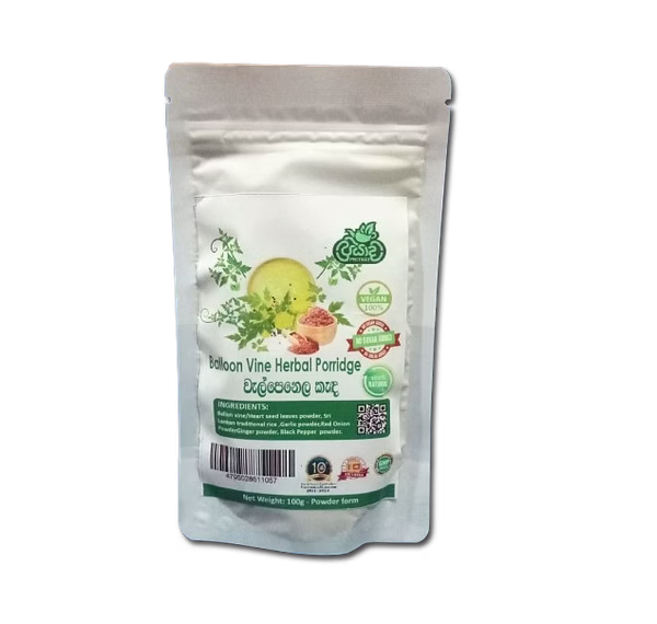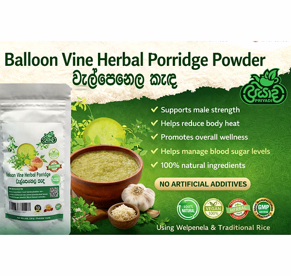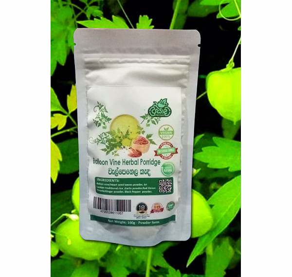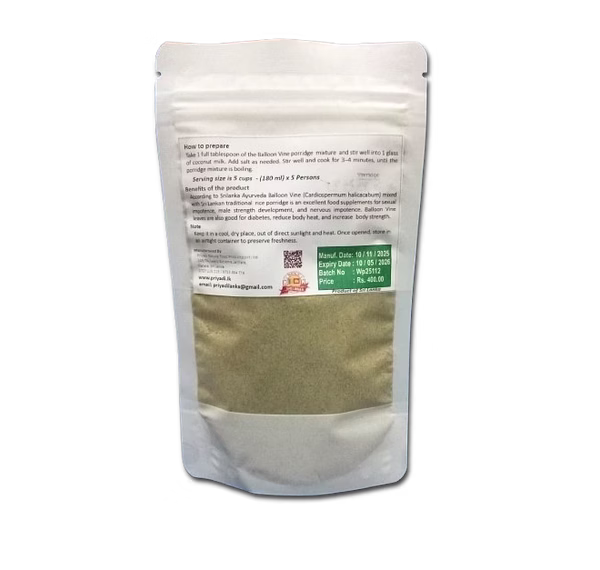 Reconnect with the wisdom of traditional Sri Lankan nutrition with our Balloon Vine (Walpenela) Herbal Porridge Powder. This carefully prepared porridge mix is made using dried Walpenela leaves and locally sourced traditional rice, following time-honored food practices.